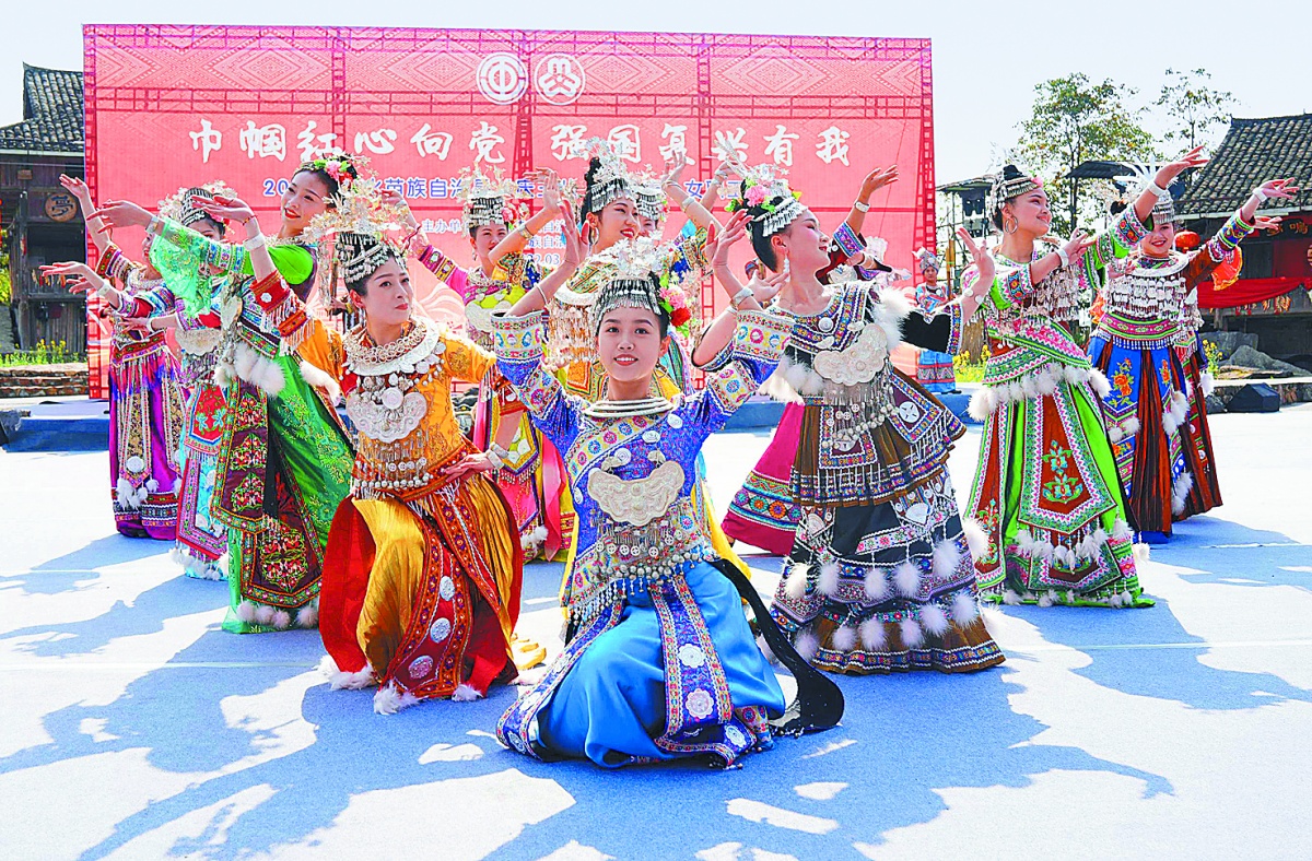 3月7日,融水苗族自治县在梦呜苗寨举行女职工少数民族服饰走秀活动,来自各行各业的数十名女职工通过展示各民族靓丽服饰,庆祝“三八”国际妇女节。龙 涛 摄