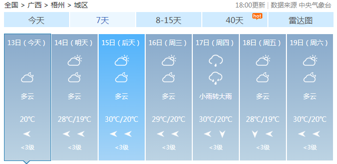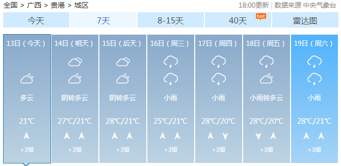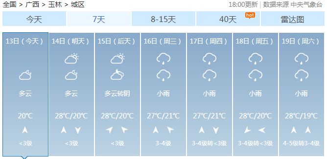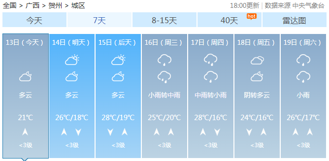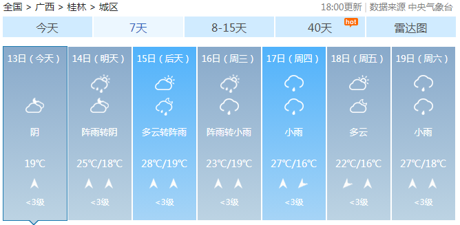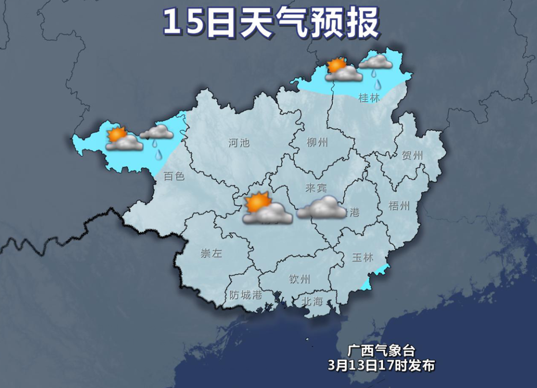 15日,全区多云间阴天,其中桂北有分散小雨。