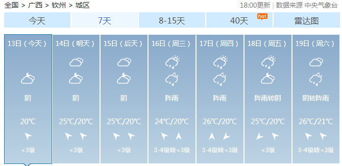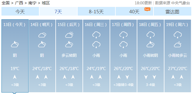 南宁市:今天晚上阴天,明天白天阴天,有分散小雨,偏南风1~2级,最低气温19℃,最高气温24℃。