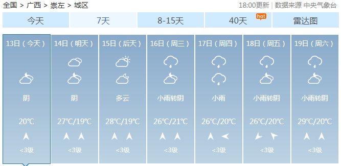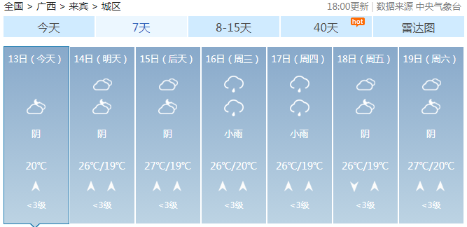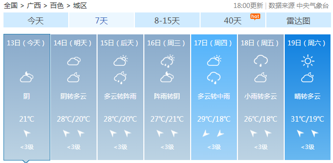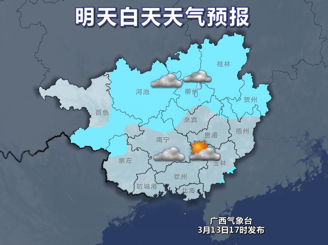 明天白天,百色、河池、柳州、桂林等市及崇左、南宁、来宾、贺州四市北部的部分地区阴天有小雨,我区其它地区阴天到多云。