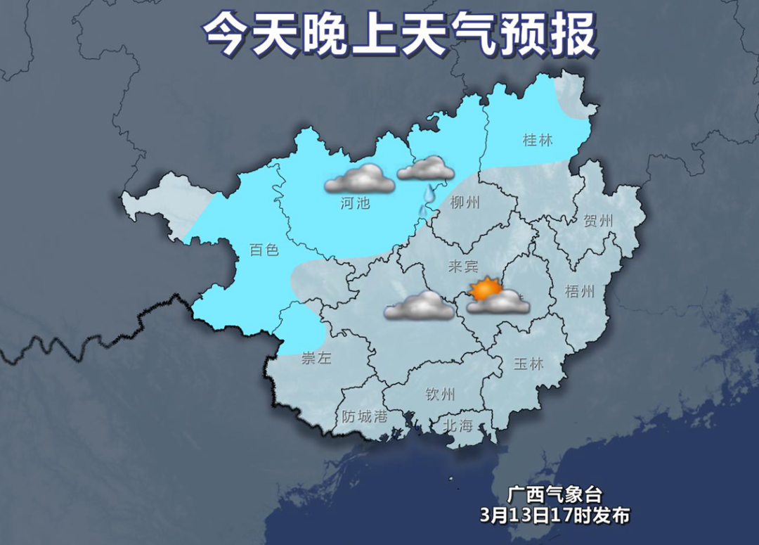 今天晚上,百色、河池、柳州、桂林等市及崇左市北部的部分地区阴天有小雨,我区其它地区阴天到多云。