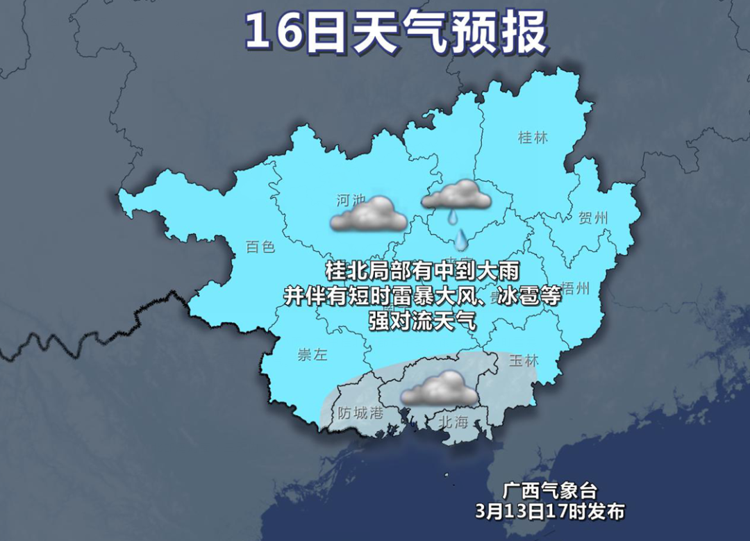 16日,全区阴天大部有小雨,其中桂北局部有中到大雨并伴有短时雷暴大风、冰雹等强对流天气。