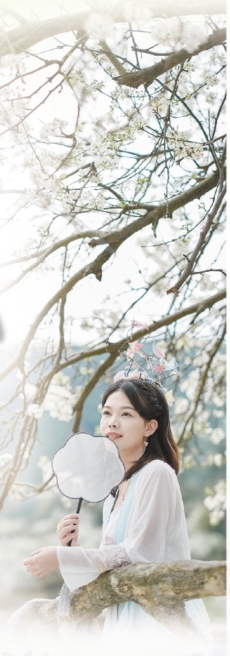 一名身着汉服的女子在钦州市钦北区板城镇碗窑村梨花谷赏花。黄开碧 摄