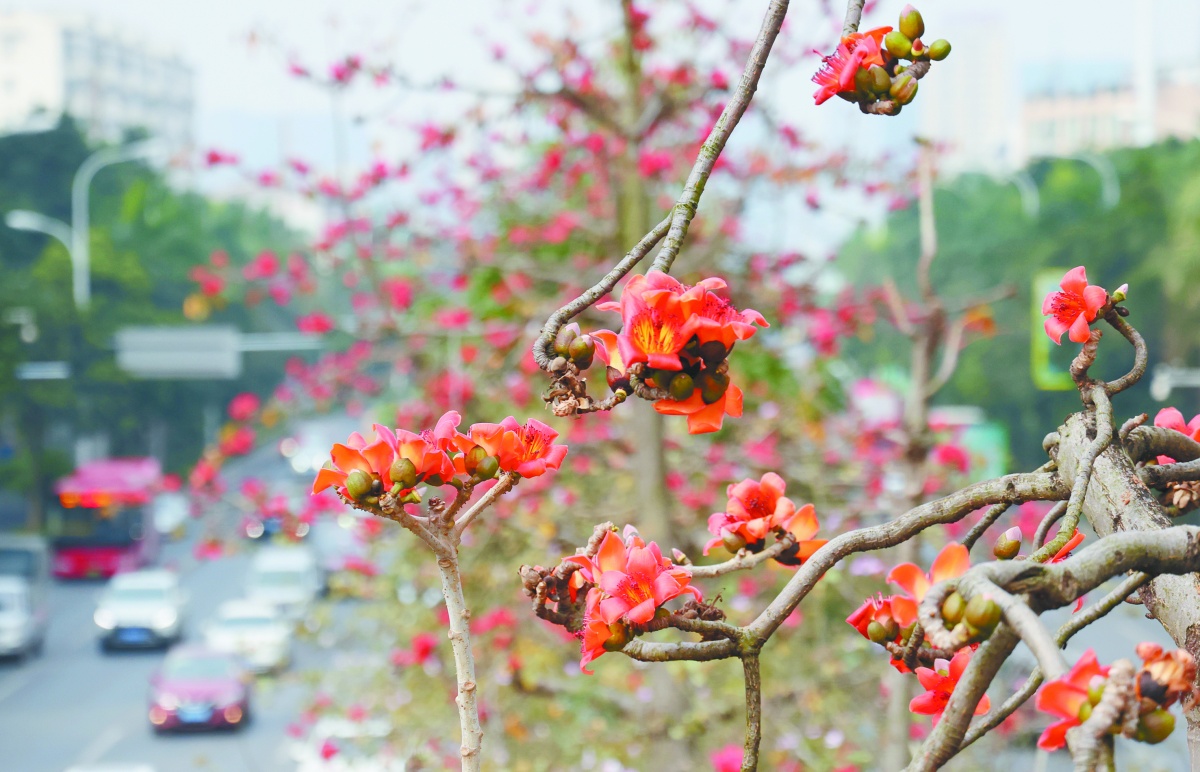 南宁市白沙大道绽放的木棉花成为亮丽风景线。南国早报记者 何定坚 摄