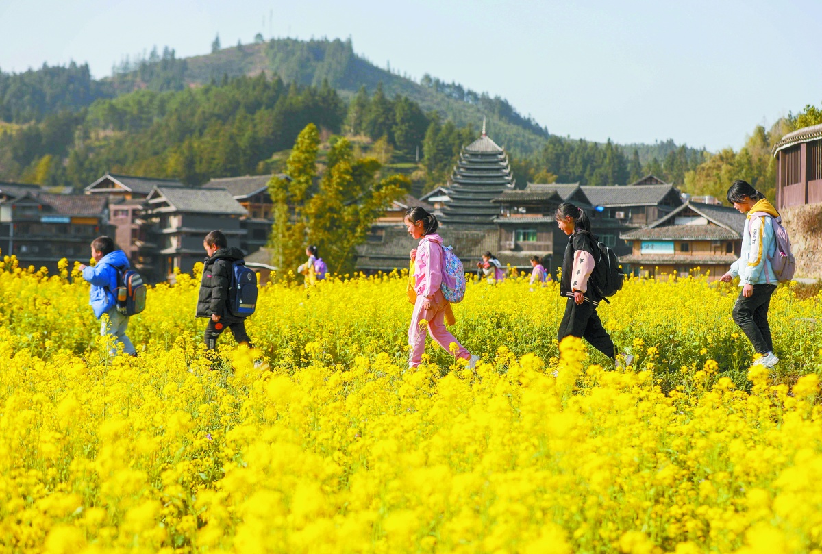 在三江侗族自治县程阳八寨景区,小学生结伴走在放学路上。龚普康 摄