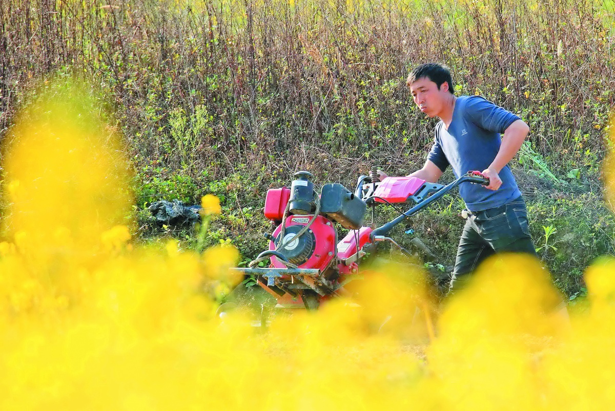 3月8日,在融安县浮石镇东江村,农民驾驶微耕机耙田,准备种植新一季作物。谭凯兴 摄