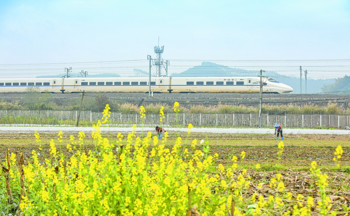 在南宁市五塘镇两山村,一列动车从农忙的大地上驶过。陈莲芬 摄