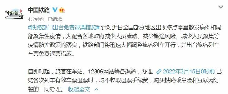 针对近日全国部分地区出现多点零星散发病例和局部聚集性疫情,为配合各地政府减少人员流动、减少旅途风险、减少人员聚集等疫情防控政策的落实,铁路部门将迅速大幅调整旅客列车开行,并出台旅客列车车票免费退票措施。