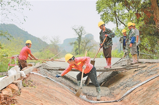 3月14日,在扶绥县新湾罐区续建配套与节水改造项目施工现场,工人们进行最后的渠道防渗作业,确保春耕生产用水。该项目总投资1544.55万元,通水后可灌溉农田面积1.38万亩。卢文斐 摄
