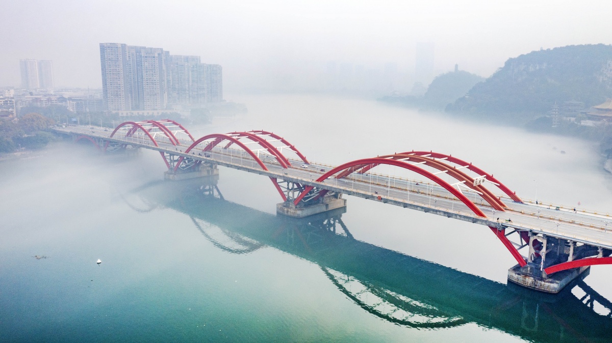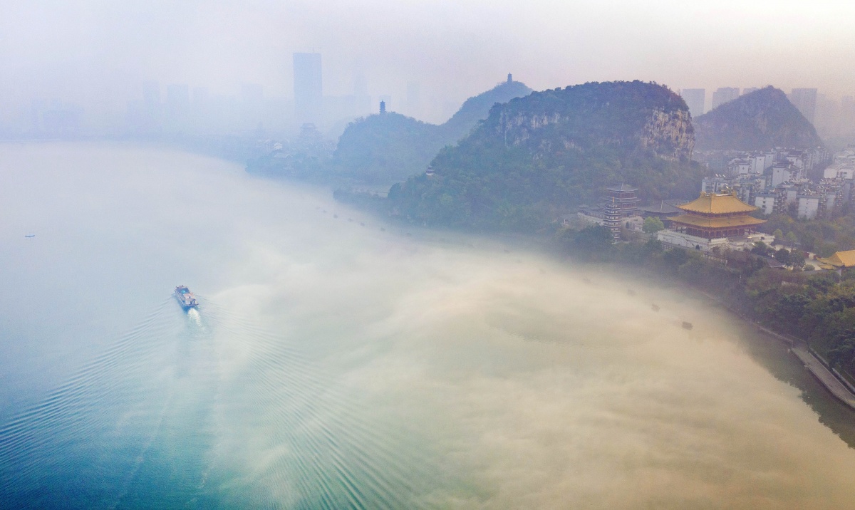 3月15日,柳州出现大雾天气,百里柳江云雾缭绕,宛如仙境。近日,2021年全国地表水水质排名状况出炉,广西柳州水质连续两年蝉联全国第一,实现“十四五”生态环境保护工作“开门红”。近年来,柳州市不断构建和完善水环境监测体系,建成广西首个河道“天眼”——柳江干流河道“天眼”监管系统,不断提升河湖动态监测监管水平。通讯员 黎寒池 摄