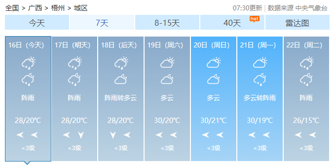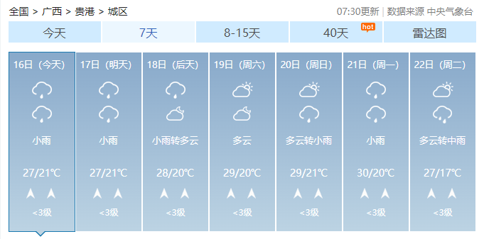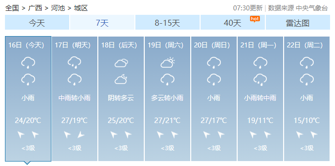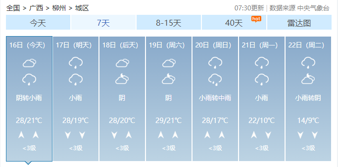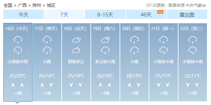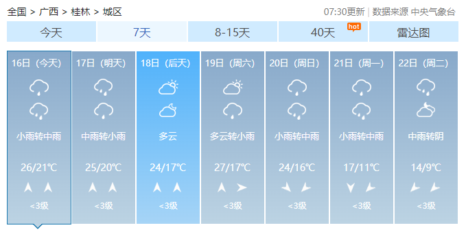 16日晚上到17日晚上,桂林、柳州、河池、贺州、来宾等市及南宁市北部的部分地区有中到大雨,局部暴雨或短时雷暴大风、冰雹等强对流天气,我区其它地区阴天大部有阵雨或雷雨。