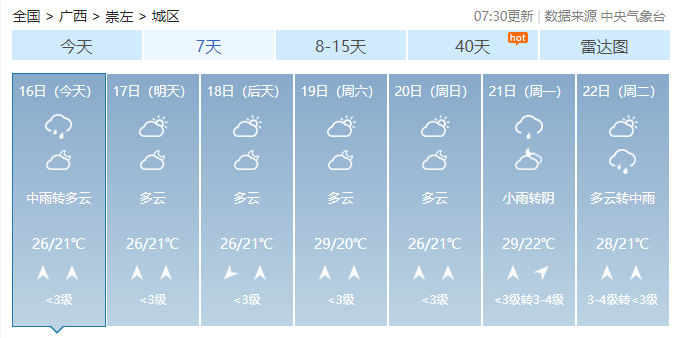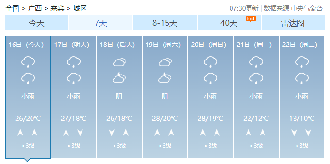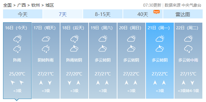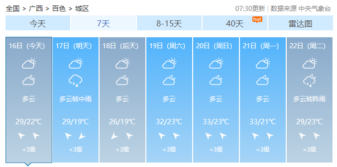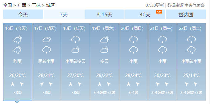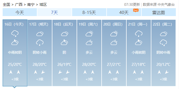 南宁市:今天,多云到阴天有小雨,局部中到大雨,偏南风2级,最低气温20℃,最高气温25℃。