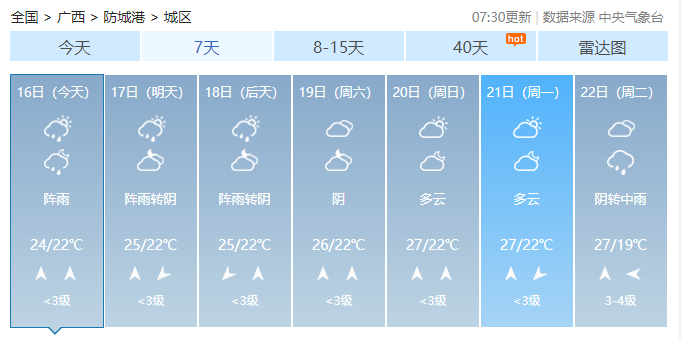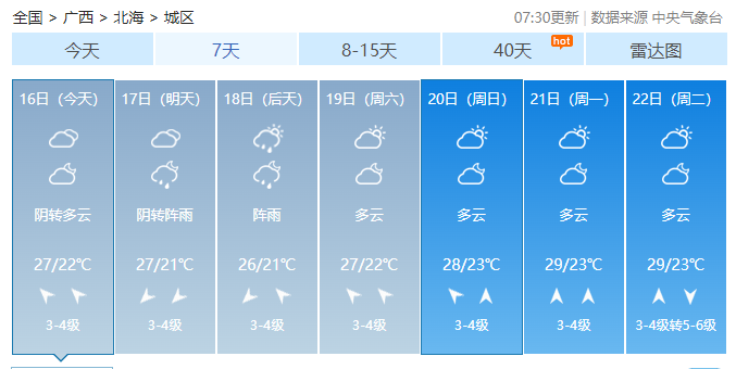 北部湾海面:16-17日,阴天到多云,东到东南风4~5级;18日,阴天有小雨,南转北风4~5级。