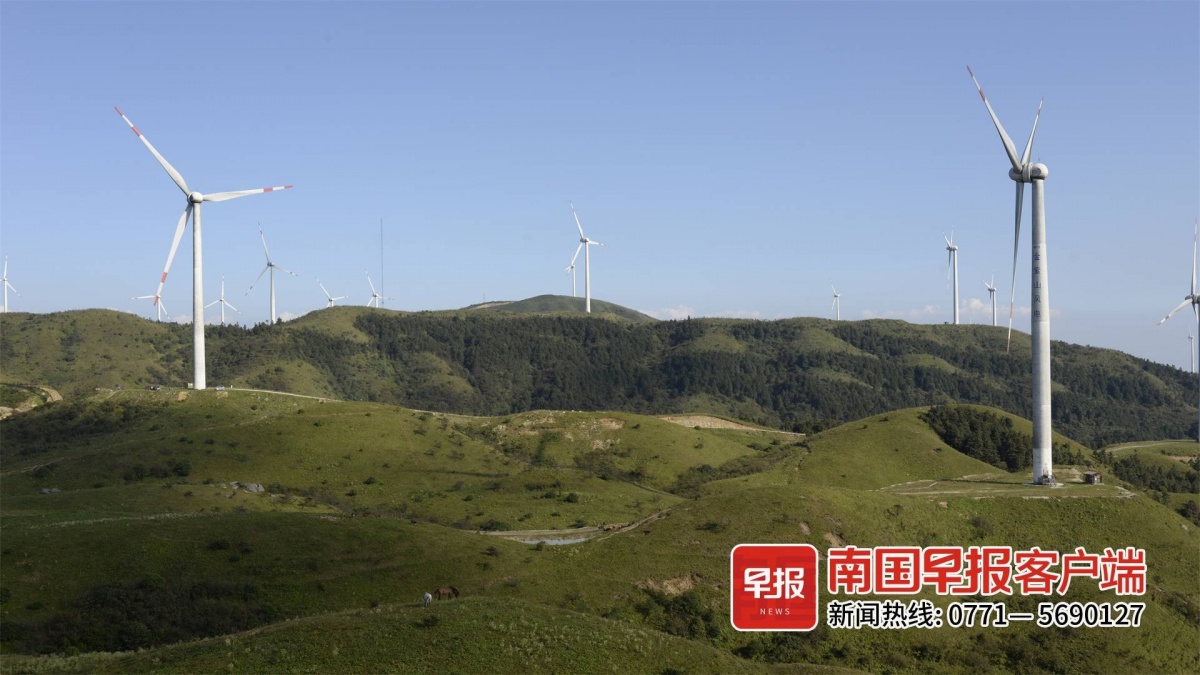 桂林不仅有如画的山水,还有一望无垠的草原。位于桂林资源县瓜里乡金江村的十里平坦草原,海拔1300米以上,这里建设有广西最大的风电场,巨大的风叶转动时,把阳光“切”成一幕一幕“投影”在草原上,置身于此,仿佛步入童话世界。