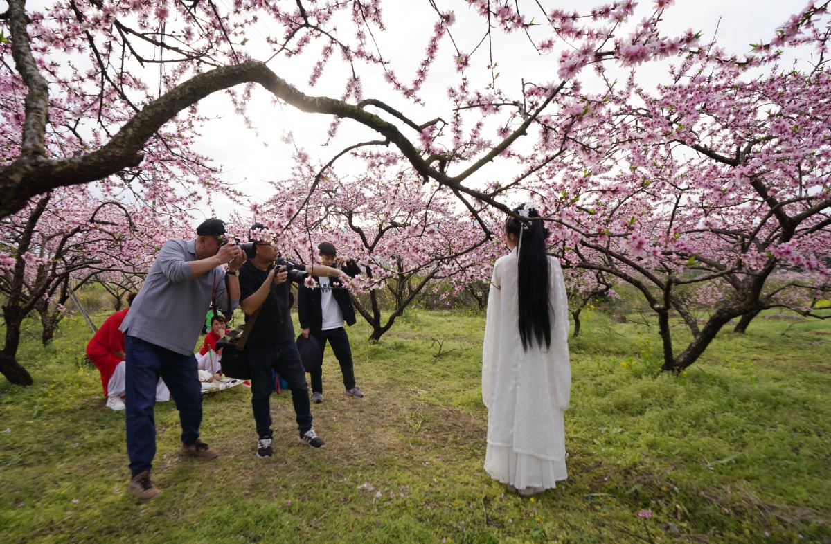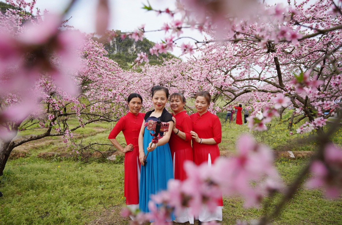 3月19日,游客在灵川县海洋乡大塘边村赏花游玩。阳春三月,该县海洋乡天桃种植基地千亩桃花竞相绽放,传统民居错落其间,构成一幅幅美丽的乡村生态图景,吸引不少游客前往赏花游玩,感受田园风光。通讯员 黄勇丹 摄