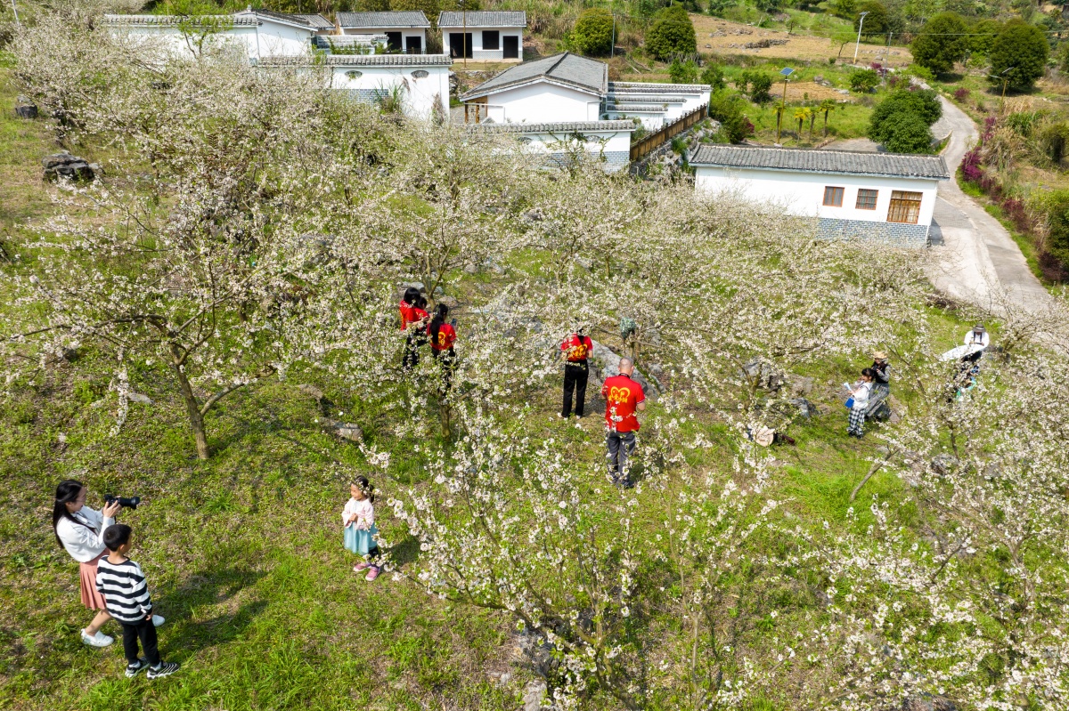 3月19日,在蒙山县新圩镇古定村古皮乡村旅游区内,游客在赏李花,拍照留念。通讯员 黄胜林 摄