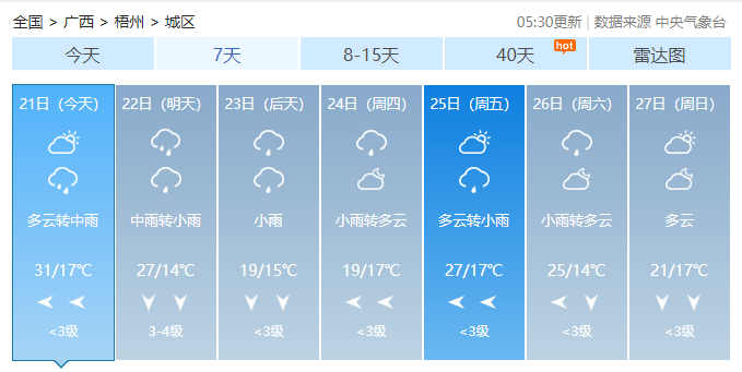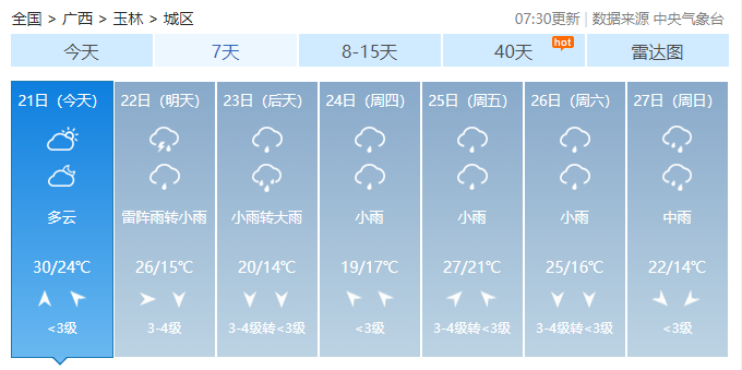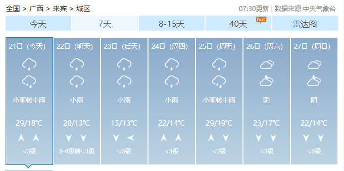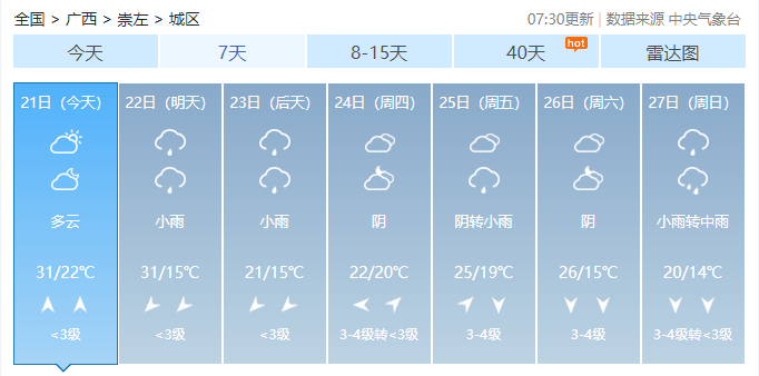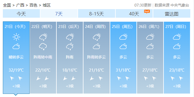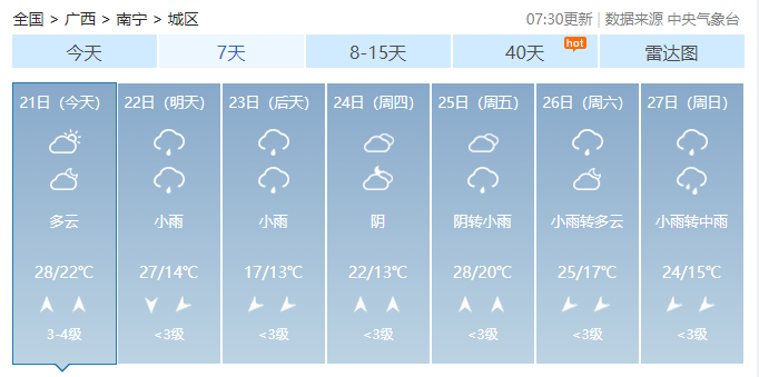 南宁市:21日白天多云间阴天,局地有阵雨,偏南风3~4级,最低气温22℃,最高气温28℃。