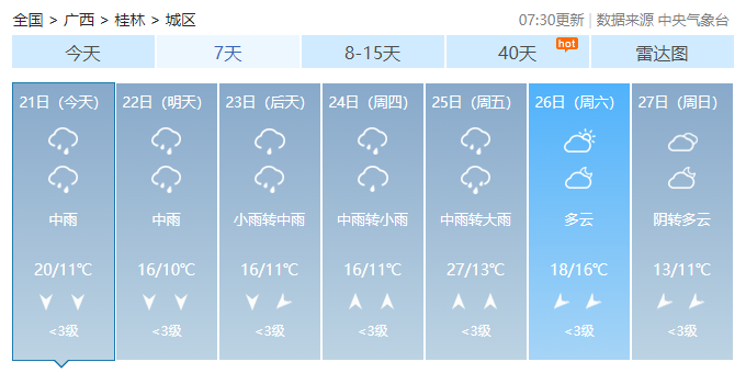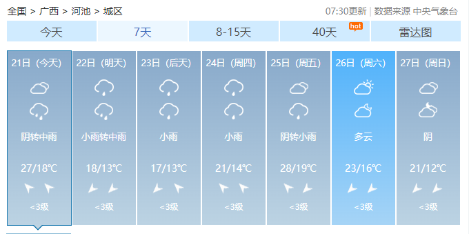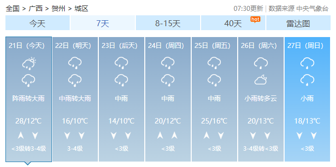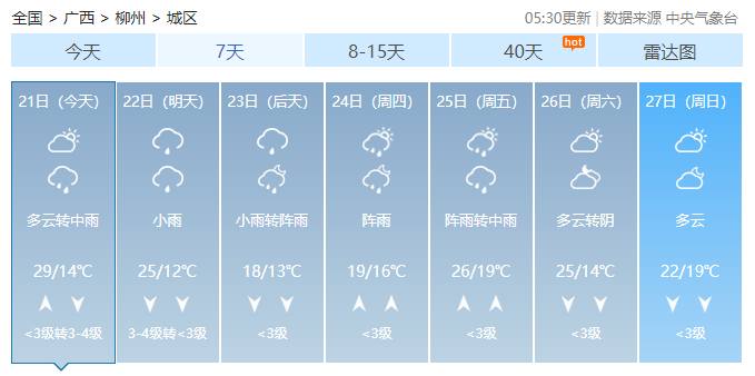 21日白天,桂林、柳州、贺州等市的部分地区阴天有阵雨或雷雨,局部中到大雨或短时雷暴大风、冰雹等强对流天气,我区其它地区多云到阴天有分散阵雨或雷雨。