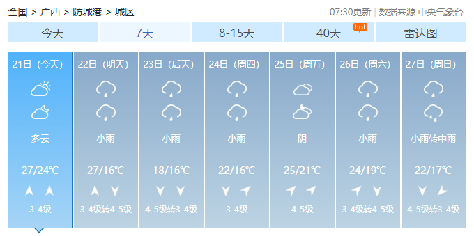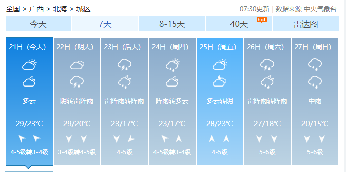 北部湾海面:21日,多云到阴天,东南风5级,阵风6级;22日,阴天有雷阵雨,南转北风5级,阵风6级;23日,阴天有阵雨,偏北风6~7级,阵风8级。请海上船只注意。
