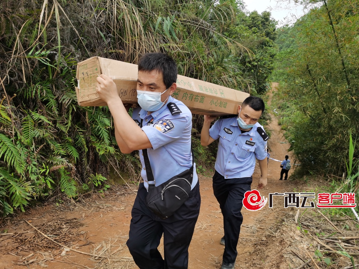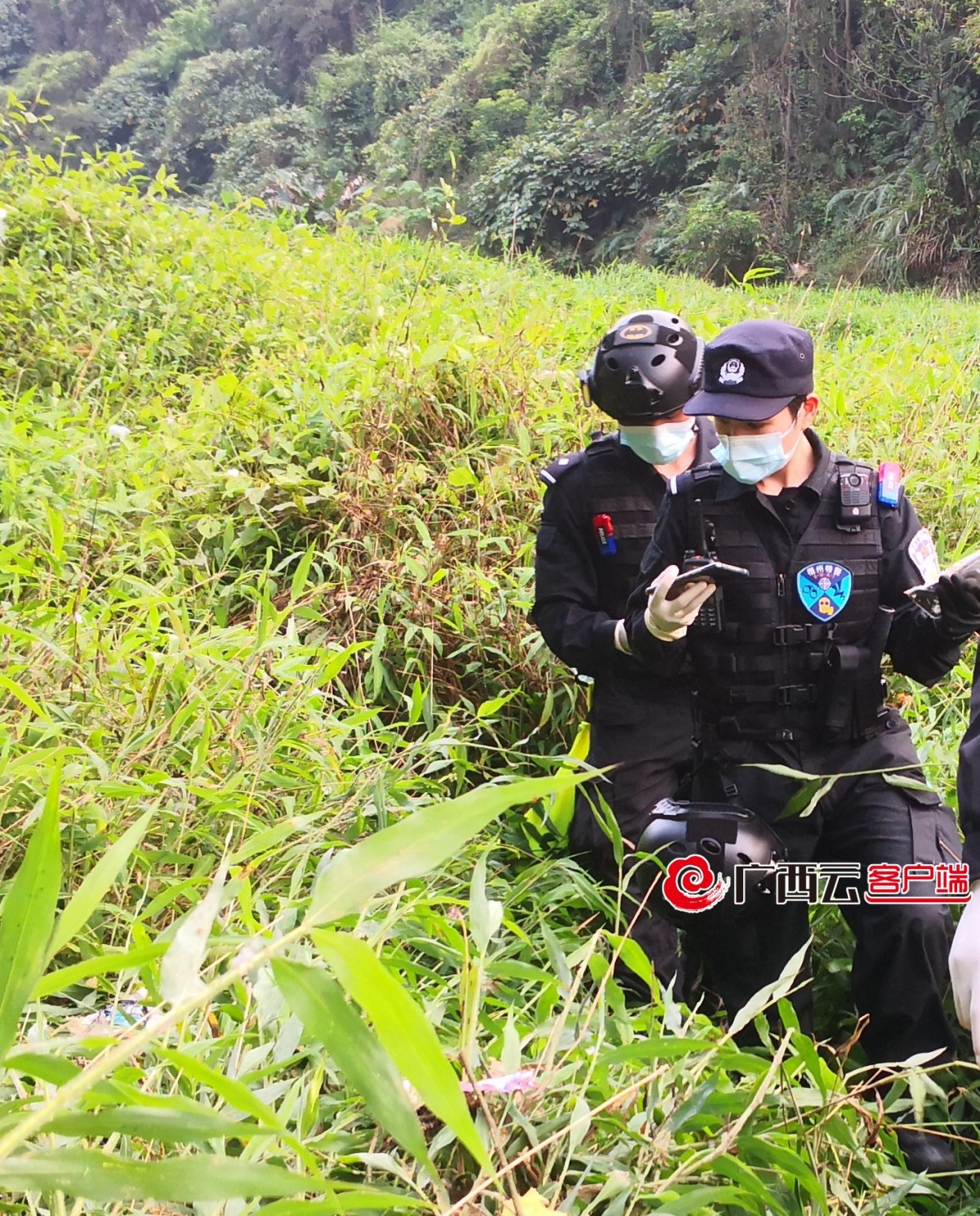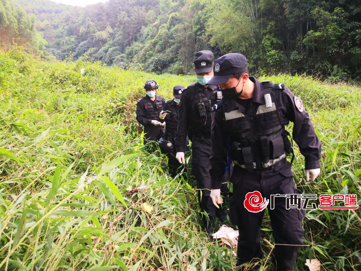 当天16时许,特巡警支队队员赶到藤县埌南镇莫埌村事发地点后,以4名队员为一组,联合民兵、消防等部门,即刻进入中心现场,对坠机所在的山坳及两侧山坡开展拉网式搜救。陡峭的山路上,随处可见特警队员忙碌的身影。