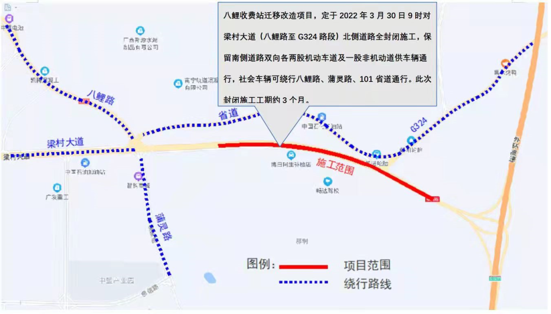 为确保“八鲤收费站迁移改造项目”梁村大道(八鲤路-G324段)顺利实施,保障道路交通安全畅通,从2022年3月30日起,预计至2022年6月30日24时止,对梁村大道(八鲤路-G324)实施道路北侧道路封闭施工,道路南侧保持两机一非车道双向通行。