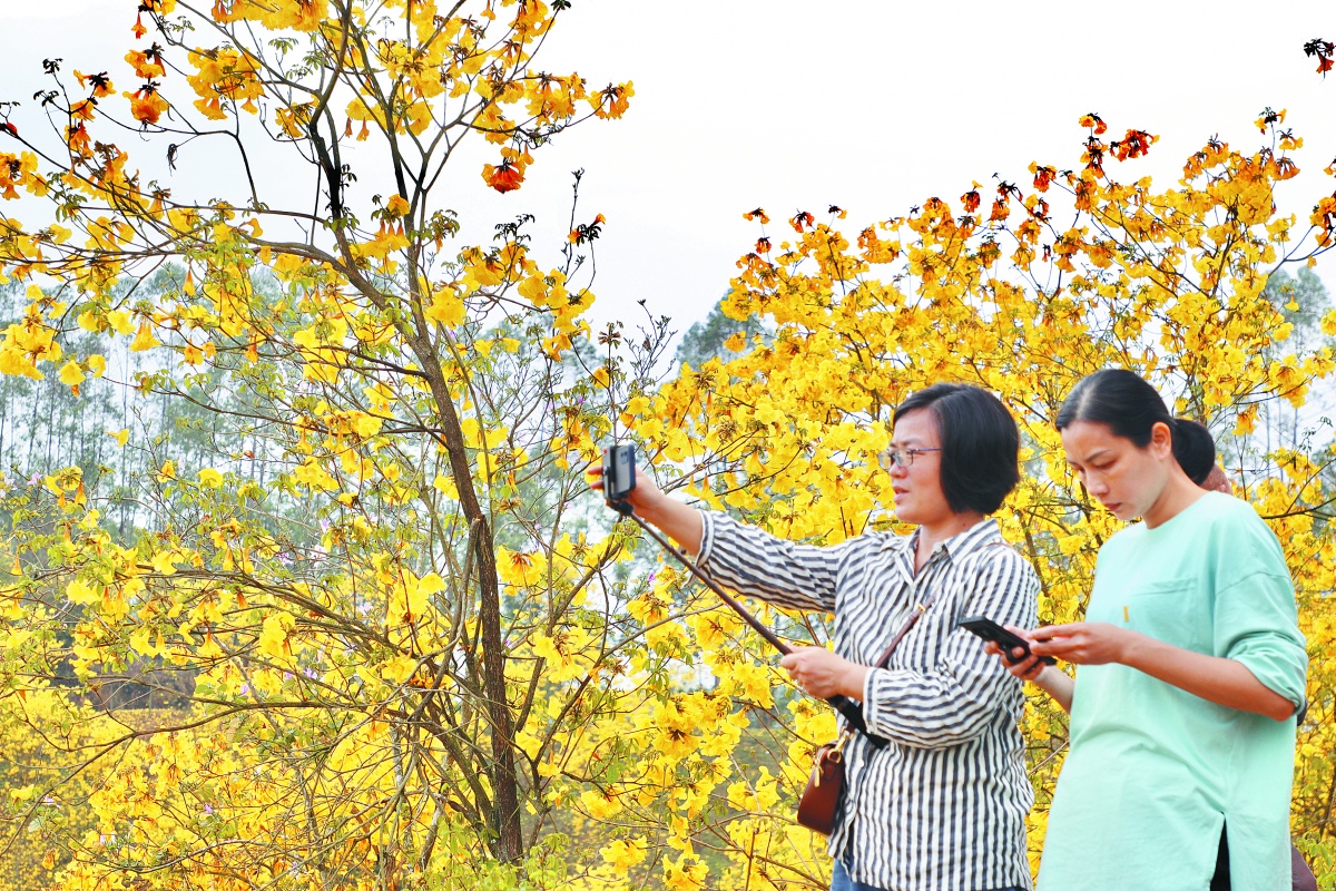 风铃满树如奇珍,点缀山村金色春。近日,藤县和平镇都坡村留村组的黄花风铃开出“黄金花海”,吸引了大批游客前来赏花打卡。