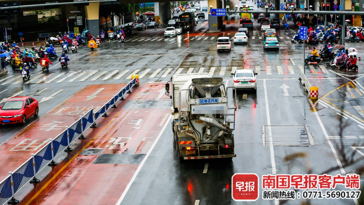 ▲民主路上,一辆水泥罐车越过实线欲左拐。