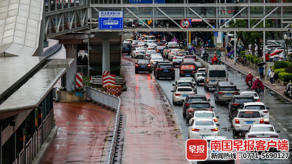 ▲民主路上,下班高峰期,一辆轿车从BRT专用道上超车。