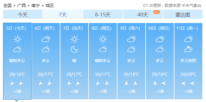 南宁市:今天白天,晴间多云,东北风1~2级,最低气温15℃,最高气温28℃。