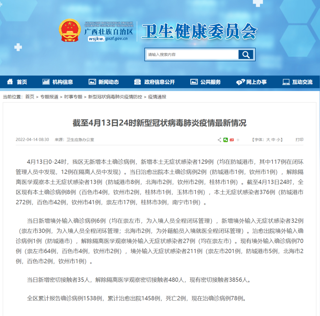4月13日0-24时,我区无新增本土确诊病例,新增本土无症状感染者129例(均在防城港市,其中117例在闭环管理人员中发现,12例在隔离人员中发现)。当日治愈出院本土确诊病例2例(防城港市1例,钦州市1例),解除隔离医学观察本土无症状感染者13例(防城港市8例,北海市2例,钦州市2例,桂林市1例)。截至4月13日24时,全区现有本土确诊病例8例(百色市4例,钦州市2例,桂林市1例,玉林市1例),本土无症状感染者376例(防城港市272例,百色市42例,钦州市41例,崇左市17例,桂林市3例,南宁市1例)。