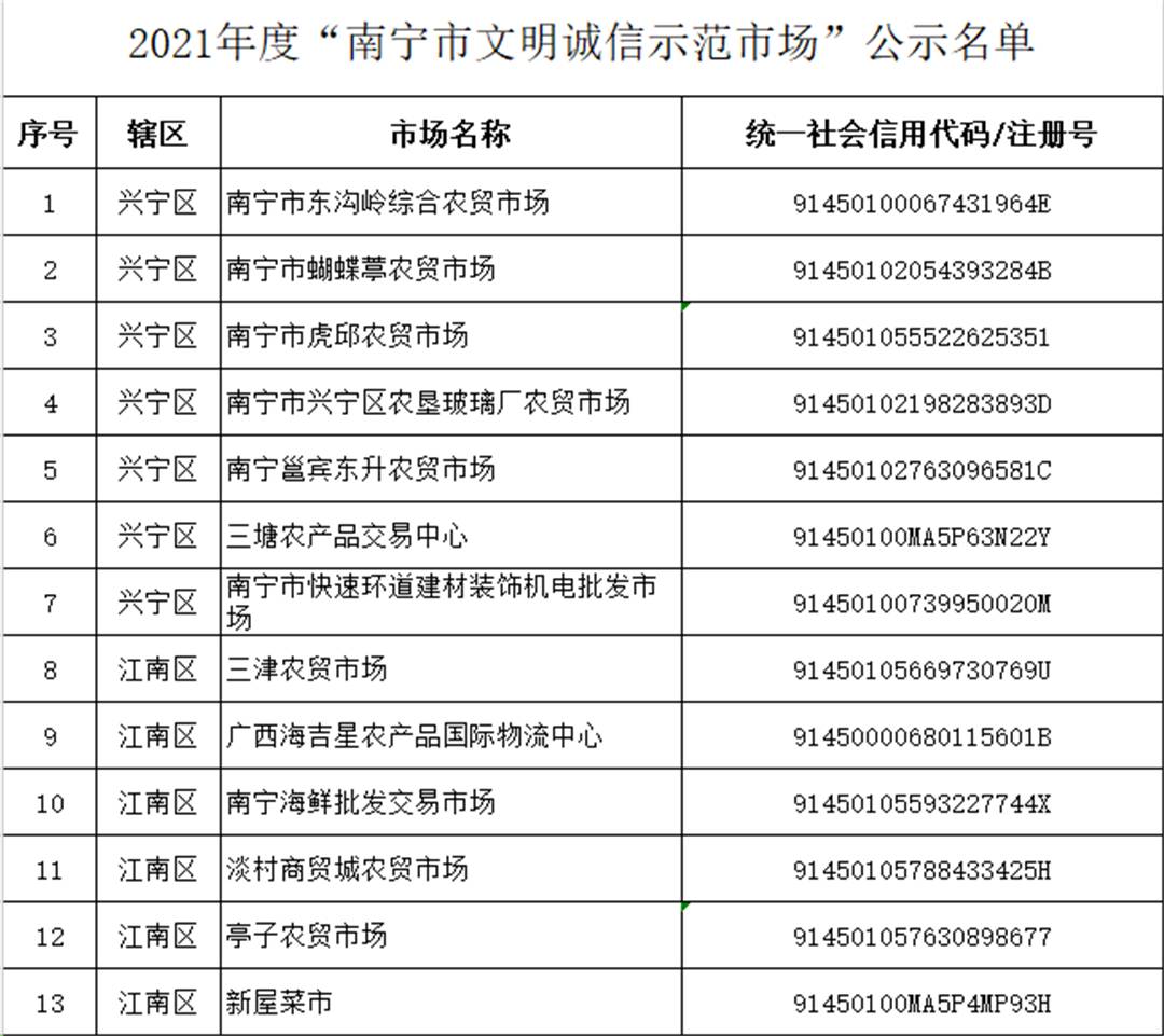 据介绍,为推进社会诚信体系建设,倡导文明诚信经营,树立行业示范典型,南宁市市场监管部门开展了“南宁市2021年度文明诚信示范市场”创建活动。申报的市场需符合《南宁市文明诚信示范市场创建标准》,并接受社会公众的监督。经市场开办者自愿申报,各县(市、区)、开发区市场监管部门审核推荐,南宁市东沟岭综合农贸市场等52个市场上榜。