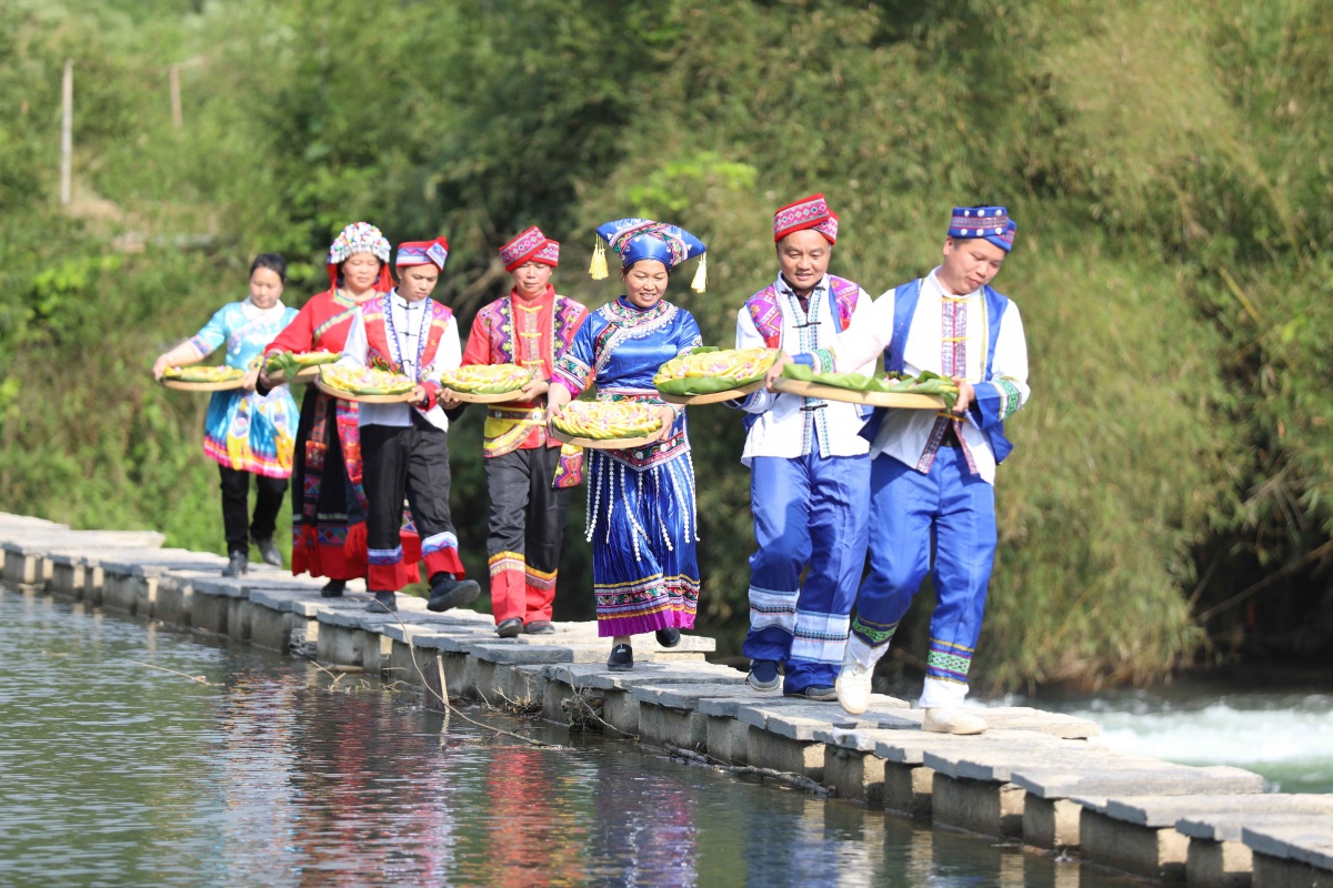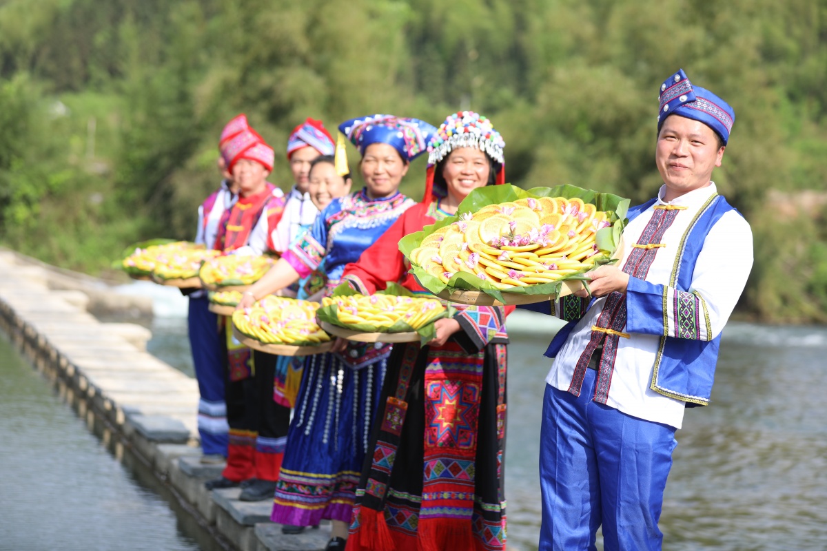 4月18日,在柳州市融安县雅瑶乡章口村西古坡屯,党员干部与群众在一起制作传统民族美食——糯米糍粑。通讯员 韦进宝 杨雯静 摄