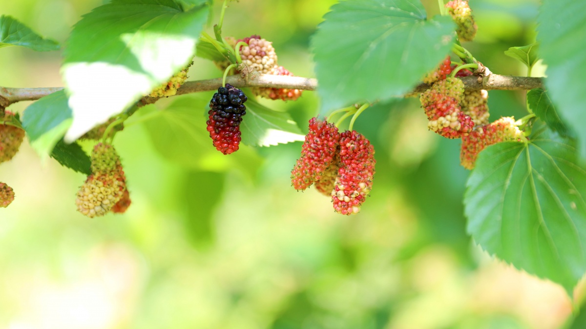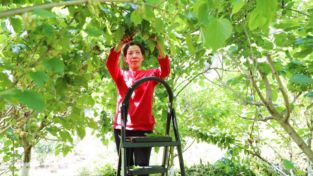 4月19日,果农在三江侗族自治县斗江镇斗江村桑葚园内剪枝。随着天气逐渐回暖,桑葚迎来盛果期,一颗颗青或红的桑葚饱满茂盛,压弯了枝头,空气里弥漫着阵阵果香。通讯员 龙佳倩 覃媛 莫良丽 摄