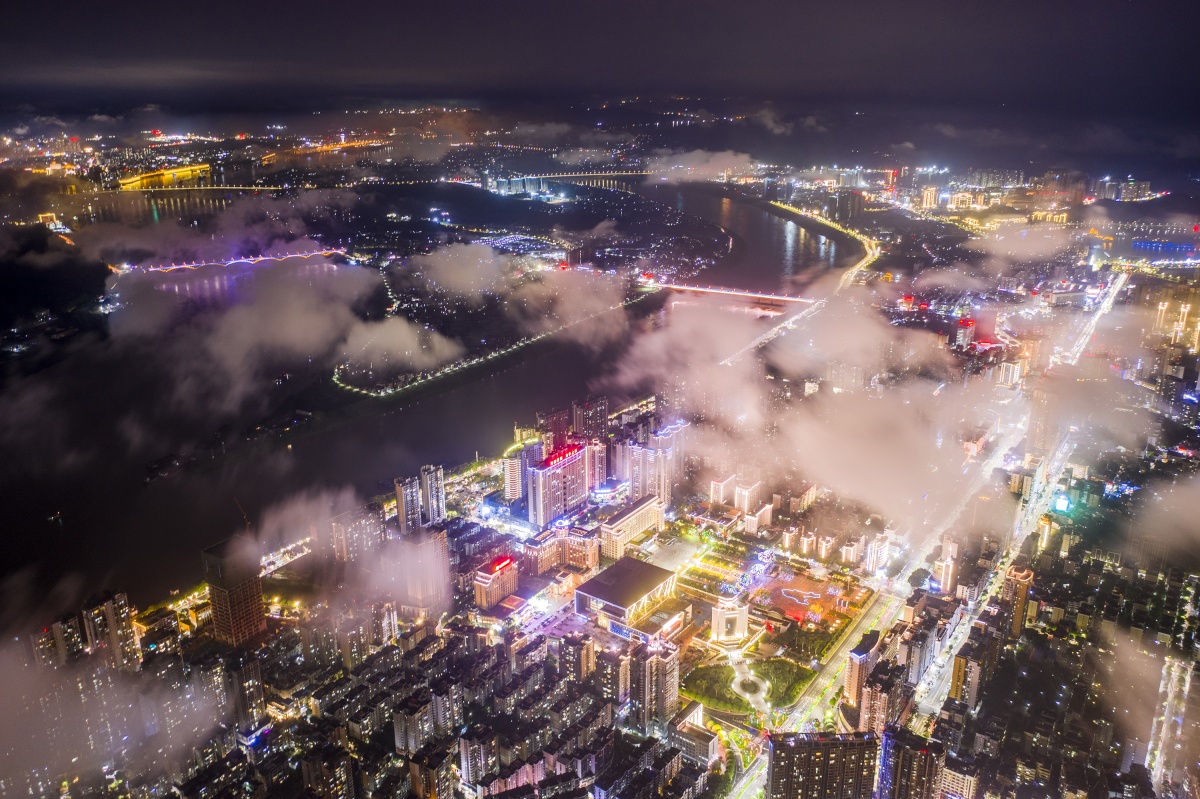 4月18日傍晚,梧州市上空云雾缭绕,在灯光的照耀下,整个城市七彩斑斓,如若仙境,景美如画。通讯员 何华文 摄