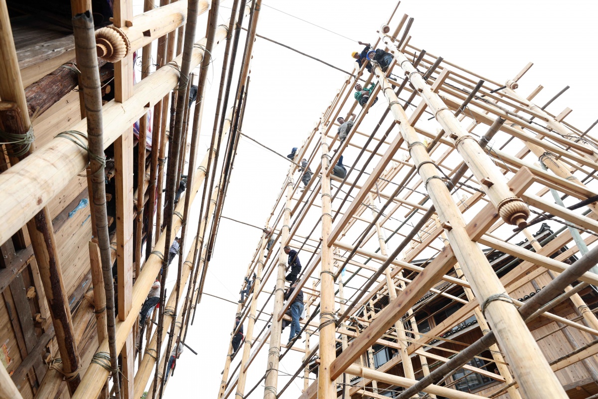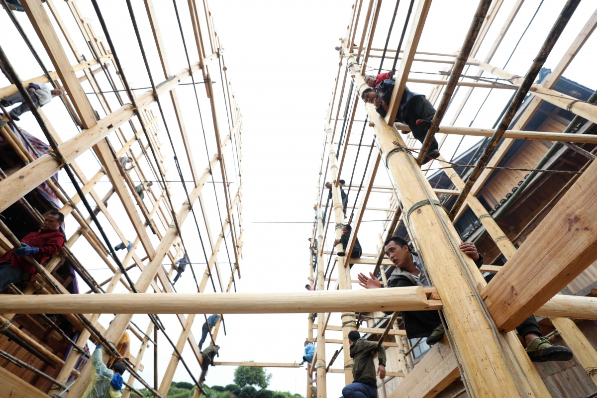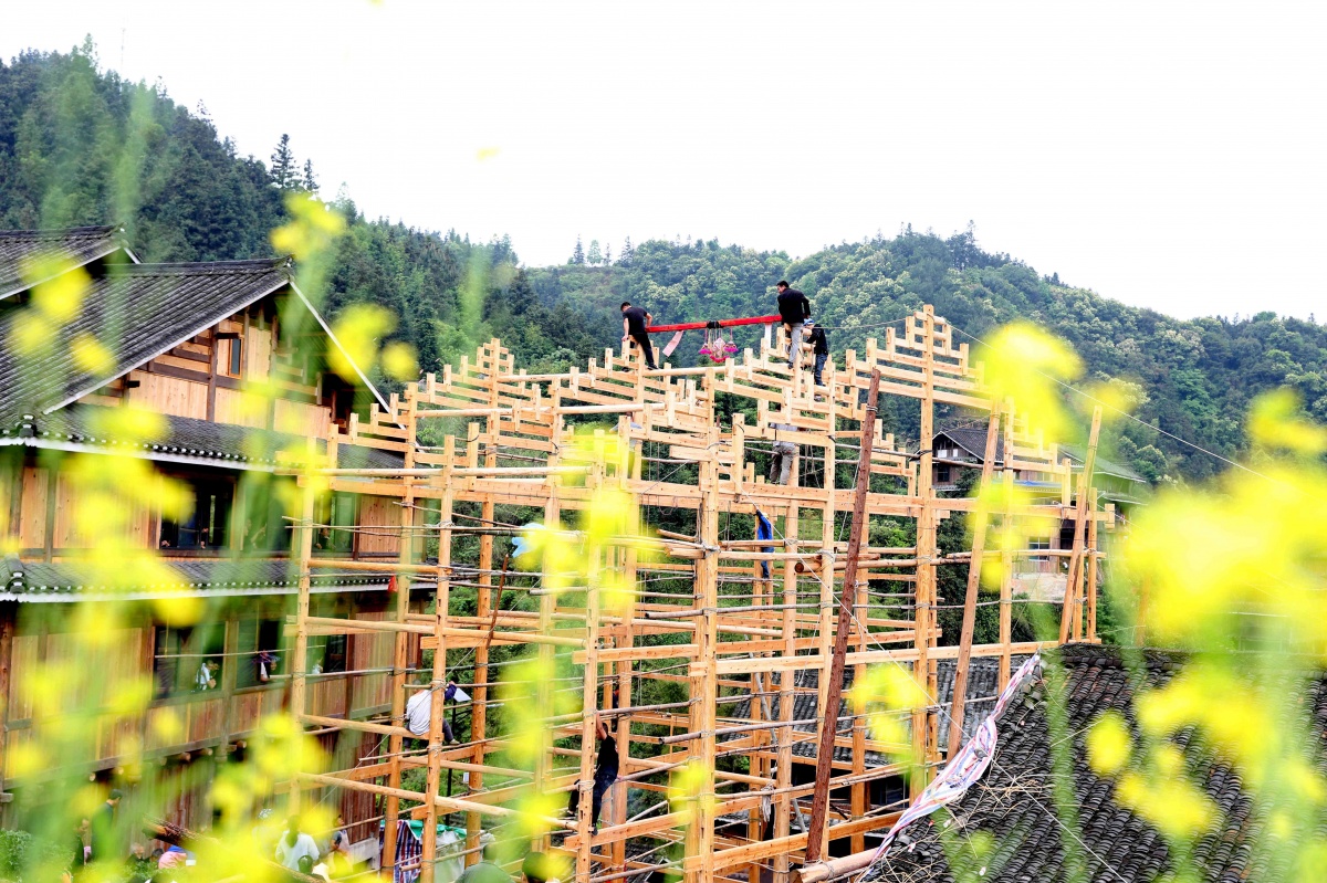 近年来,三江全力保护少数民族传统村落自然风貌,全面提升人居环境,使古老侗寨焕发新生机,让传统村落彰显新乡愁。图为4月22日,三江侗族自治县林溪镇程阳八寨景区一户人家在新建吊脚木楼。通讯员 龚普康 韦丽婷 摄