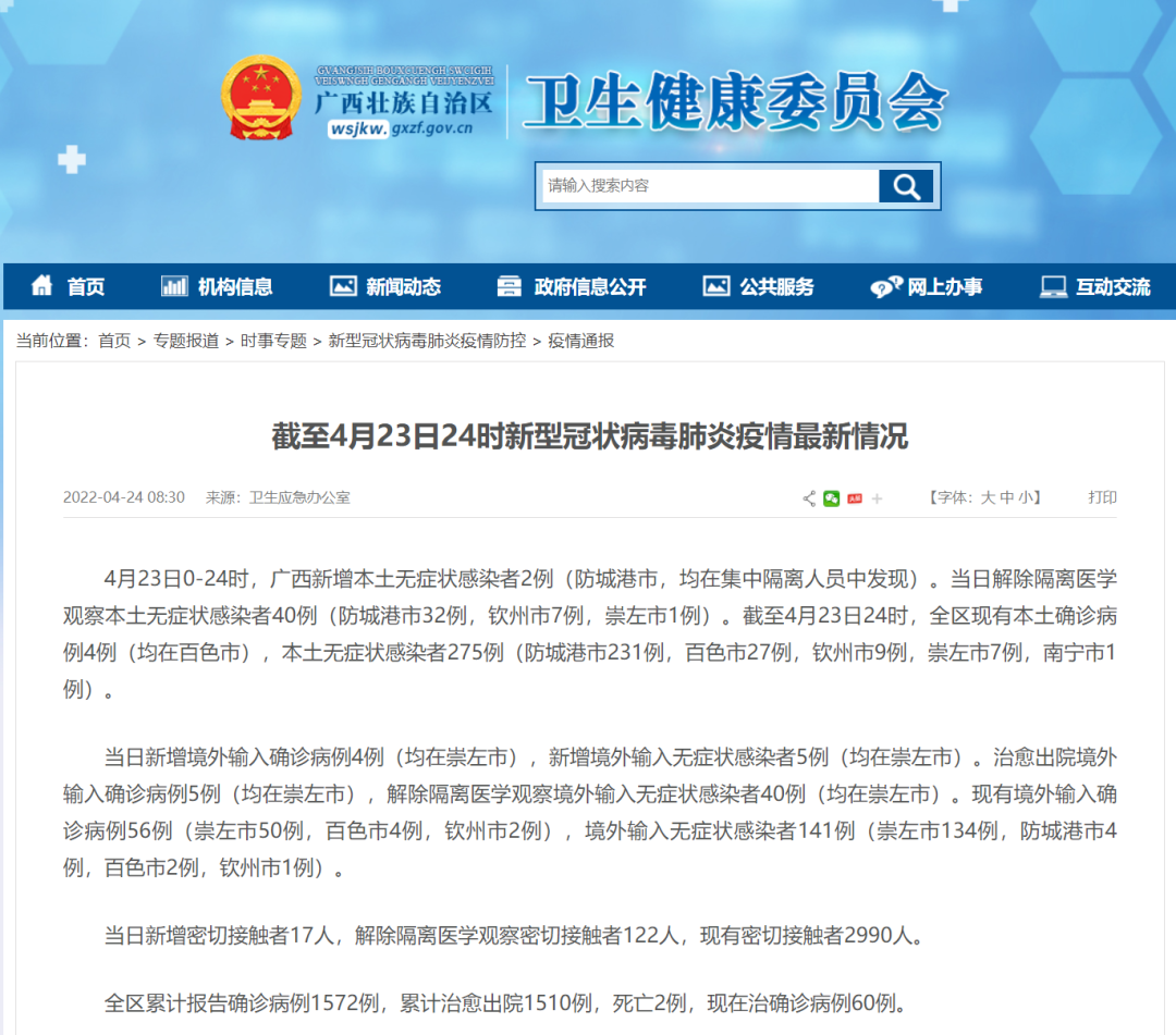 4月23日0-24时,广西新增本土无症状感染者2例(防城港市,均在集中隔离人员中发现)。当日解除隔离医学观察本土无症状感染者40例(防城港市32例,钦州市7例,崇左市1例)。截至4月23日24时,全区现有本土确诊病例4例(均在百色市),本土无症状感染者275例(防城港市231例,百色市27例,钦州市9例,崇左市7例,南宁市1例)。