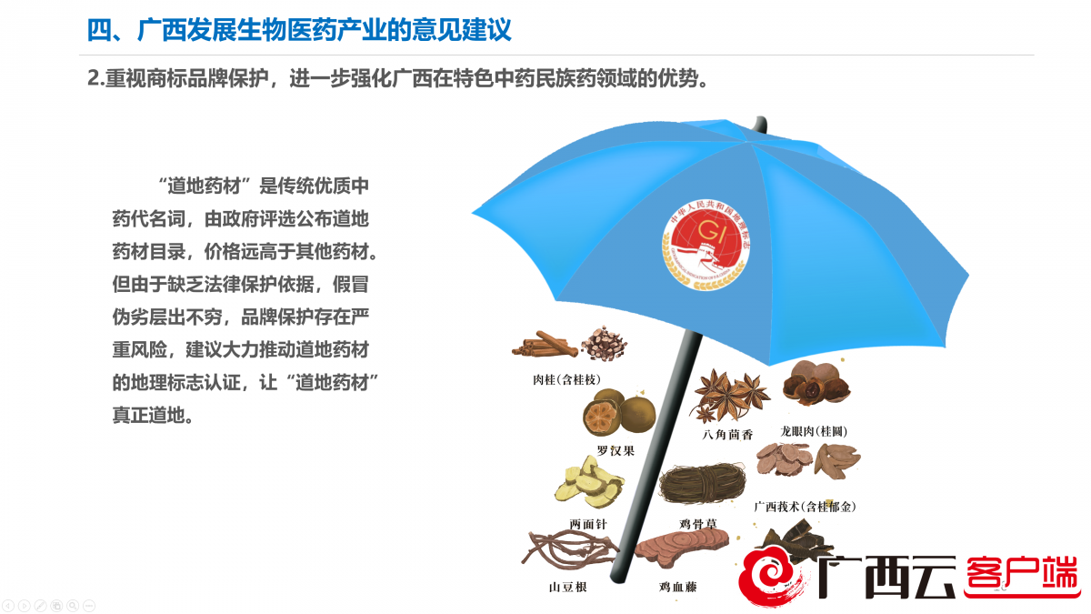 《报告》针对广西发展生物医药产业提出了建议:强化知识产权对产业创新发展的支撑作用;重视商标品牌保护,进一步强化广西在特色中药民族药领域的优势;增强 “链主”企业培育,在南宁、桂林等优势区域探索引入VIC(VC风险投资+IP知识产权+CRO医药研发合同外包服务)模式,为产业创新发展提供实现路径;鼓励仿制药企业勇于发起专利挑战,争做“首仿药”,享受市场独占期;充分发挥广西生物医药产业招商工作专班的作用,利用引企引智资源导向目录,筛选出与广西资源条件、创新需求契合度较高的企业列入招商目标对象,结合广西实际实现精准招商。