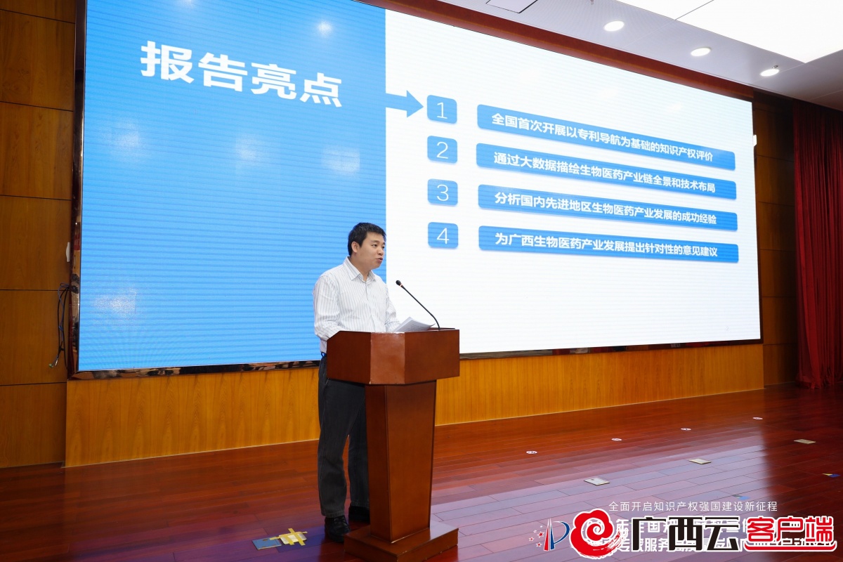 4月20日,在2022年全国知识产权宣传周广西活动暨院士专家服务高质量发展广西行启动仪式上,广西壮族自治区知识产权发展研究中心发布《中国(广西)生物医药产业知识产权评价报告暨引企引智资源导向目录》(以下简称《报告》)。该《报告》是全国首个生物医药产业创新主体与重点人才知识产权评价报告,通过知识产权大数据描绘生物医药产业链全景和技术布局,分析国内先进地区产业发展成功经验,为广西生物医药产业创新发展提出有针对性的对策建议。