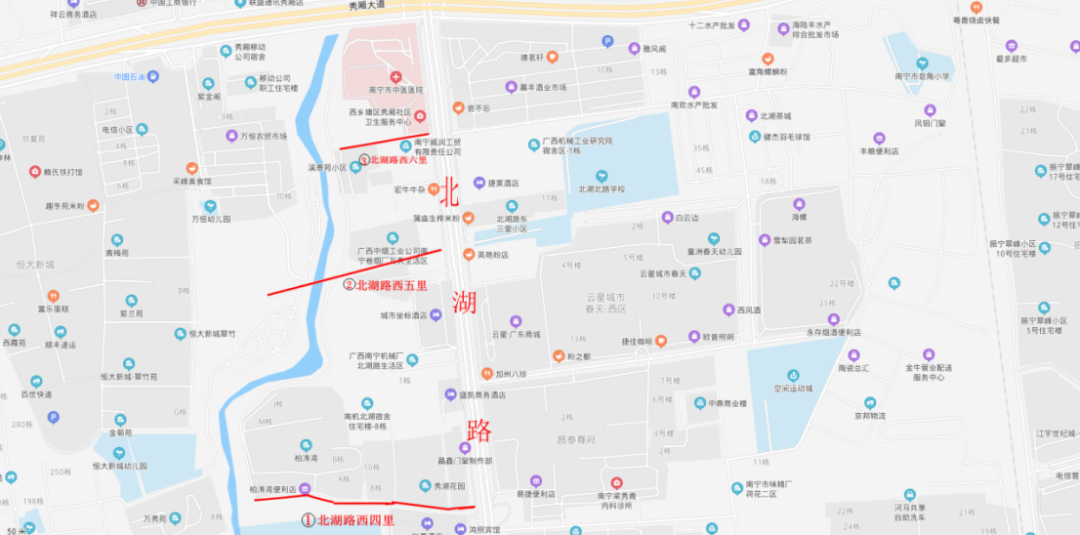 北湖路西五里:东起北湖北路,向西经广西中烟工业公司南宁卷烟厂万秀生活区外围墙,至朝阳溪。
