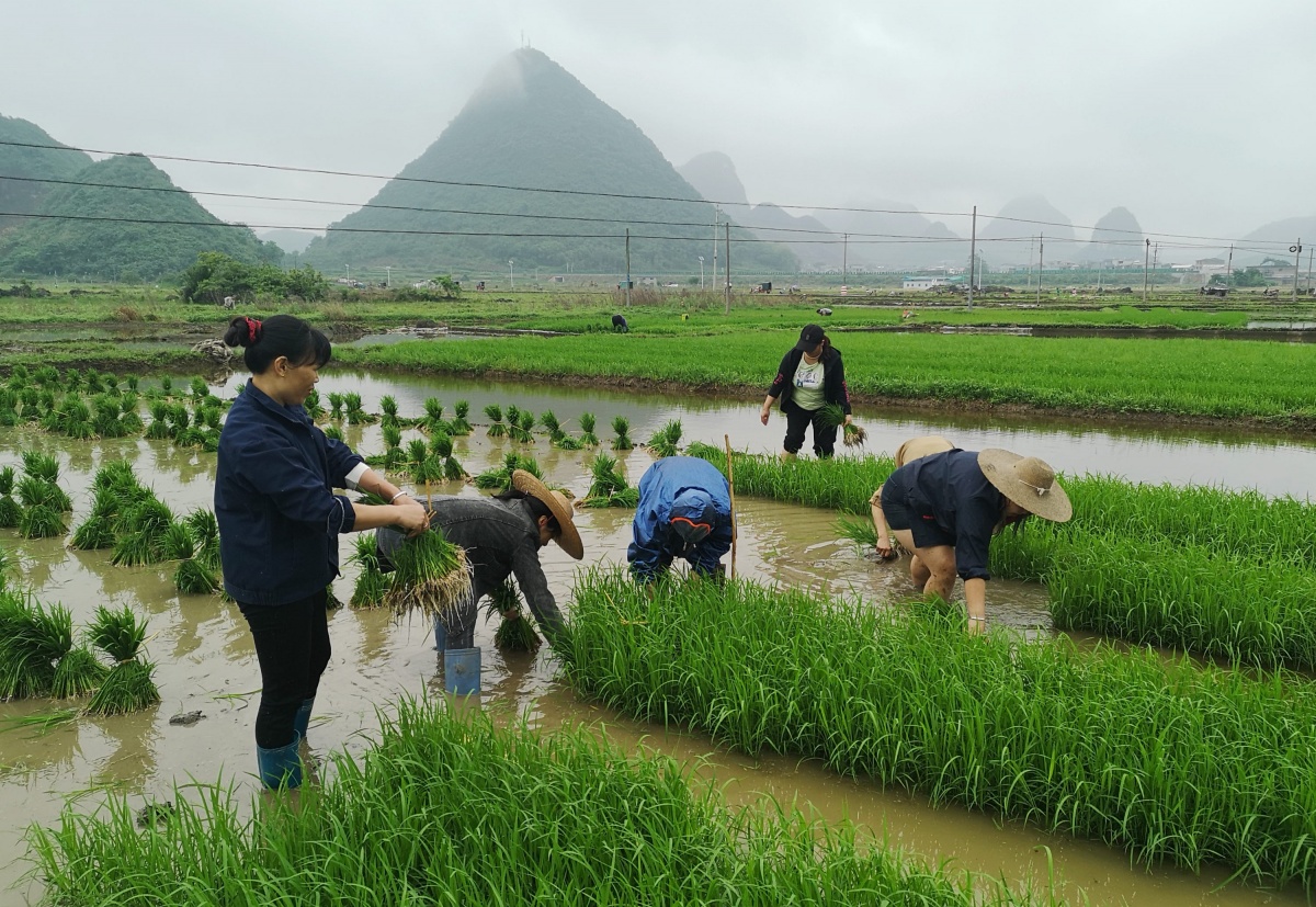 4月30日,罗城仫佬族自治县四把镇农民在田间劳作。眼下,正是春耕生产的大忙时节,该县各乡镇农民抢抓农时,及时开展耕地、插秧等工作,确保实现水稻丰收,田间地头到处一派忙碌景象。今年,该县持续抓好粮食安全工作,坚决遏制耕地“非农化”、防止“非粮化”,计划种植早稻12.06万亩。通讯员 蒙增师 摄