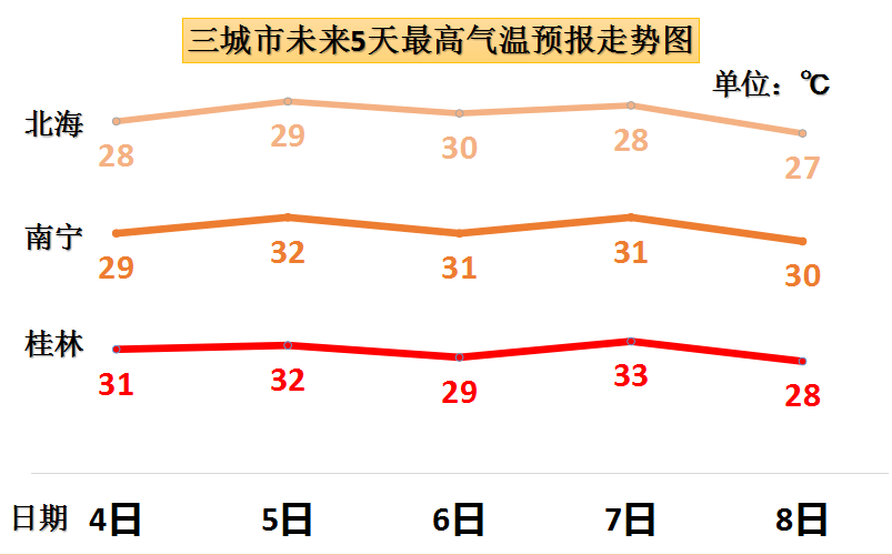 根据广西气象台5月3日预报,未来几天广西气温不会有太大起伏,在阳光、南风的辅佐下,大部最高气温保持在25~30℃,不少地方最高气温达到30℃+,各地稳定“发热中”。