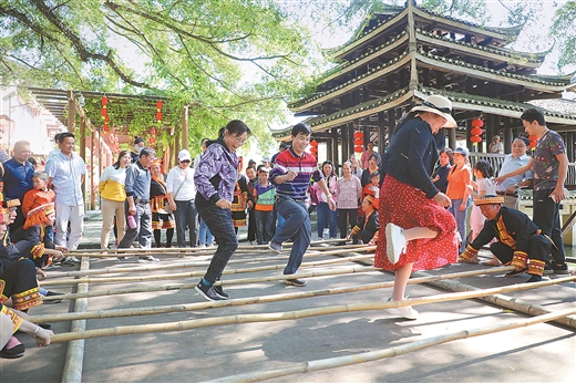 5月3日,游客在蒙山县长坪瑶族乡水韵瑶寨欢跳竹竿舞。“五一”期间,该乡推出竹竿舞、瑶族婚嫁等系列文化活动,吸引不少游客前来感受瑶族文化的魅力。关新 摄