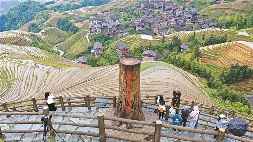 5月1日,在龙胜各族自治县龙脊梯田景区,游客在观光游览。从5月1日至5月30日,该景区推出龙脊特惠游活动,广西籍游客持本人有效身份证购买龙脊梯田景区门票可享受半票优惠,推动当地旅游业复苏。潘志祥 潘勇干 摄
