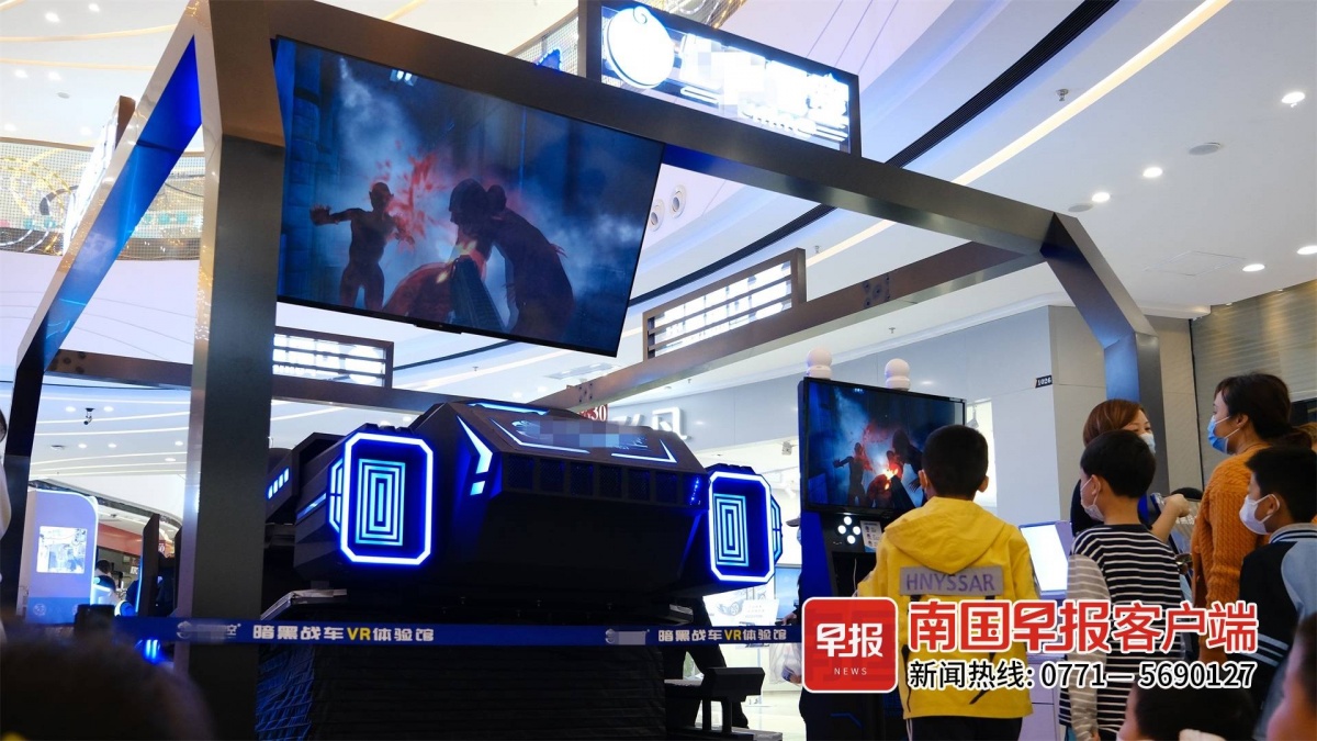 4月17日,在南宁市大唐天城购物中心的一家VR体验馆里,一名六七岁的小男孩正戴着VR眼镜体验“凶宅”探险。随着影片播出,“战车”来回晃动,画面中出现一个个鬼怪,孩子被吓得尖叫连连。