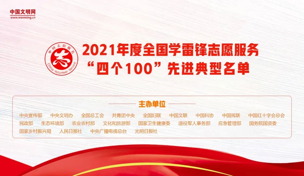 2021年10月至2022年3月,中央宣传部、中央文明办等部门和单位共同组织开展了2021年度全国学雷锋志愿服务“四个100”先进典型宣传推选活动,宣传推选出了100个最美志愿者、100个最佳志愿服务组织、100个最佳志愿服务项目和100个最美志愿服务社区。