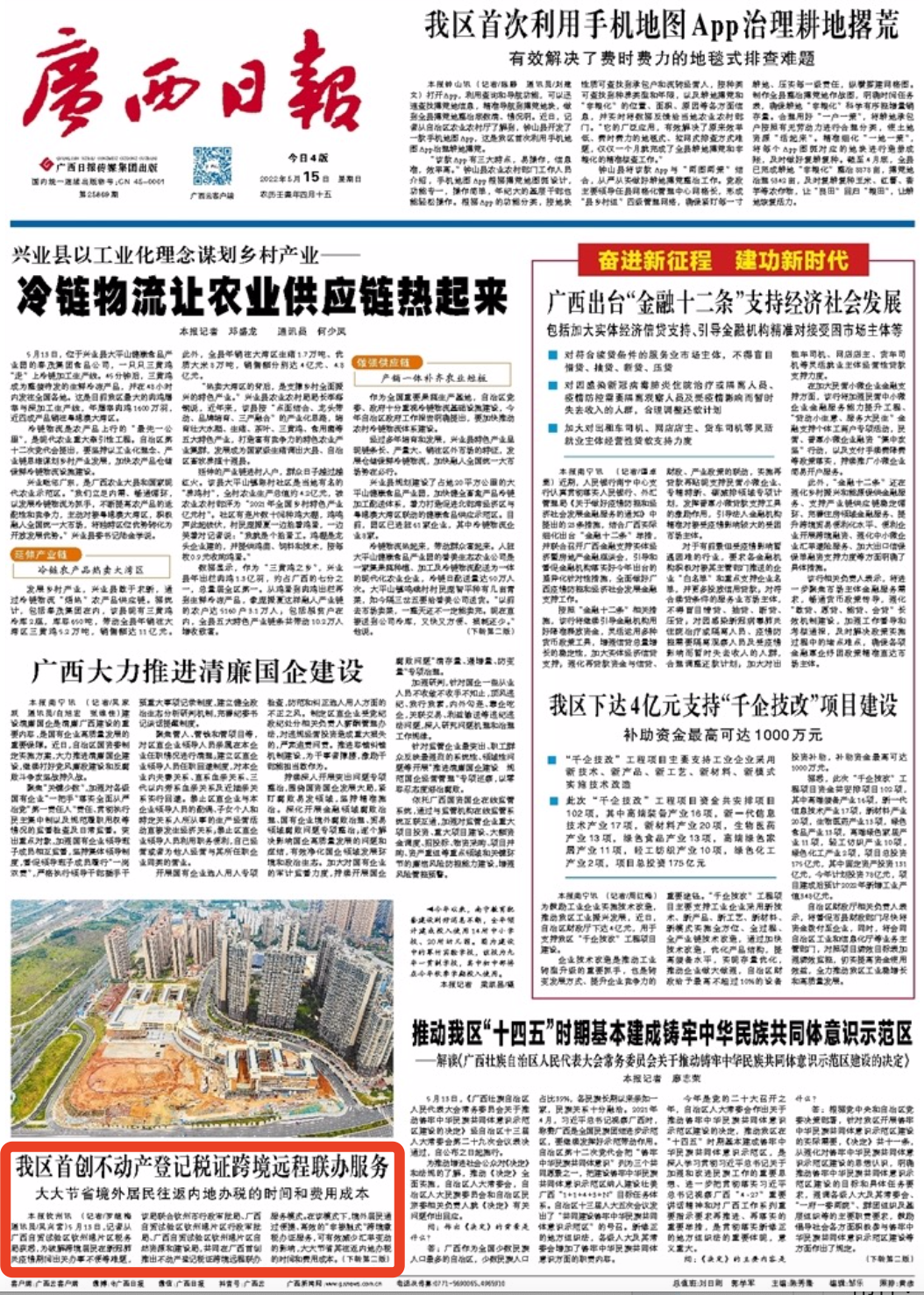 窗口前移,业务办理实现境外电子延伸。依托广西电子税务局与全国财税关库银横向联网系统(TIPS),突破传统行政区域限制,打造线上“不动产登记税证业务办事大厅”,跨境居民不用入境即可办理不动产税证业务,切实减轻缴税办证负担。