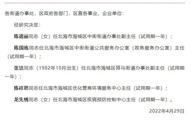 徐文媛同志(女)挂任北海市人民政府副秘书长(挂任期1年,为2022年2月至2023年2月);