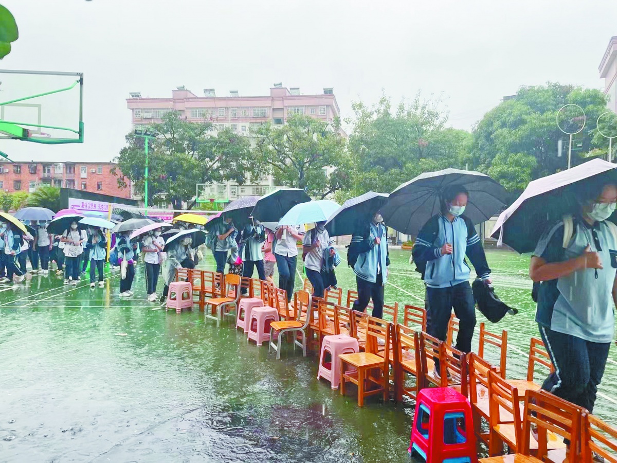 网传的图片显示,受强降雨影响,该校操场一些低洼处开始积水,老师们冒雨从教室里搬出闲置的凳子,用凳子拼成一条临时的“木桥”,学生们有序排队从“桥”上进入教室。
