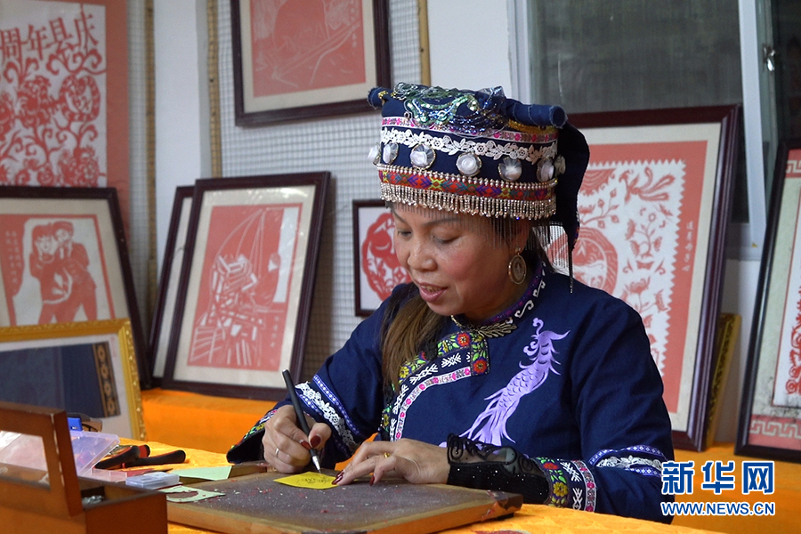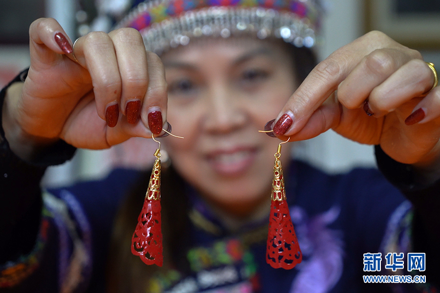 仫佬族剪纸技艺代表性传承人罗华清在制作耳环。新华网 刘君 摄