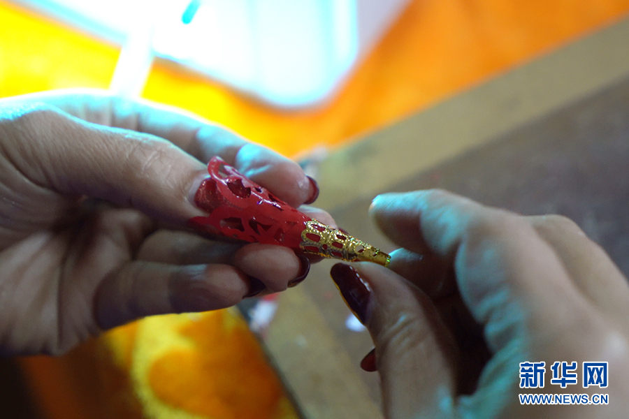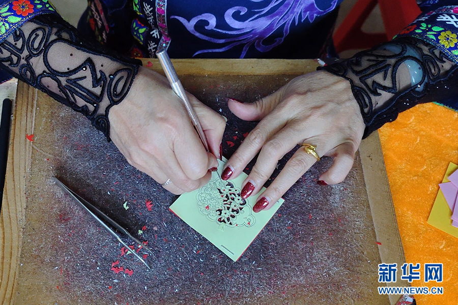 仫佬族剪纸技艺代表性传承人罗华清在制作耳环。新华网 谷雨 摄